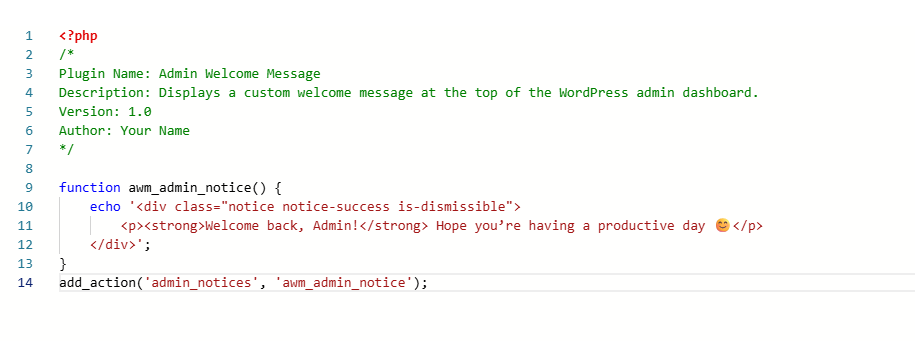Funktsioon: Näitab sõnumit “Tere tulemast tagasi, Admin! Loodan, et sul tuleb produktiivne päev” sinu WordPressi juhtpaneeli ülaosas.